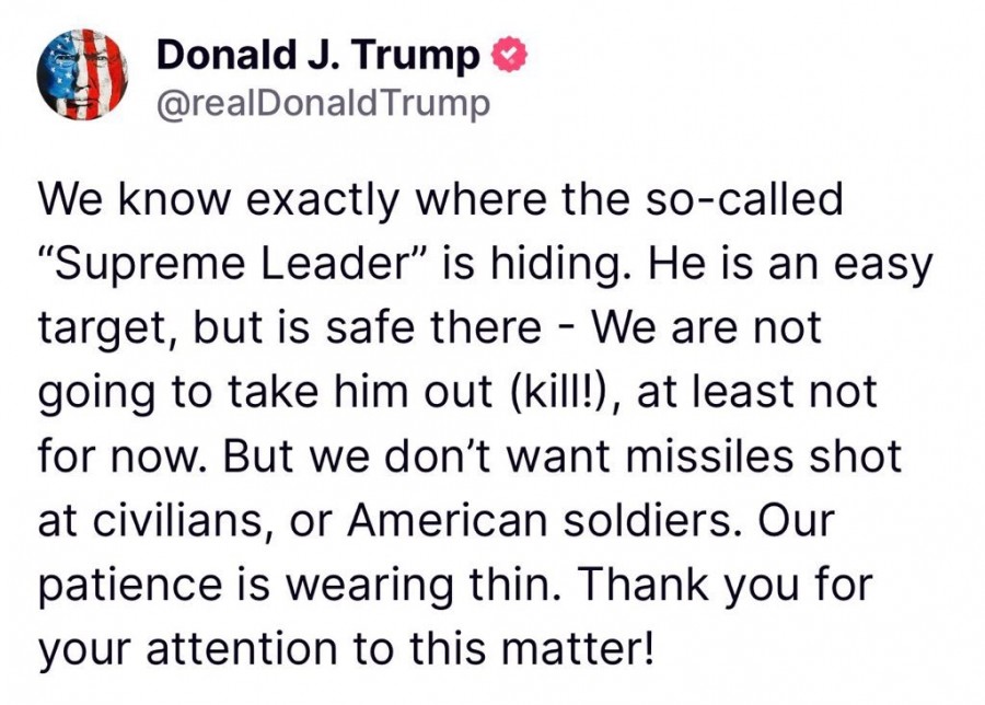 Donald Trump aseguró que Estados Unidos tiene el control total sobre los cielos de Irán y exigió la rendición inmediata del ayatolá Alí Jamenei. Trump aseguró en redes sociales tenerlo localizado y que es “un blanco fácil” y que no van a matarlo “Cuando menos por ahora”.