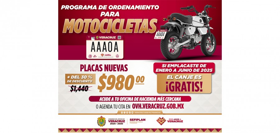 Xalapa, Ver., sábado 01 de noviembre de 2025.- El Gobierno del Estado de Veracruz, a través de la Secretaría de Finanzas y Planeación, informa que, a partir de hoy esta disponible el Canje de Placas para Motocicletas, como parte del programa de Dignificación y Modernización de las Oficinas de Hacienda del Estado.