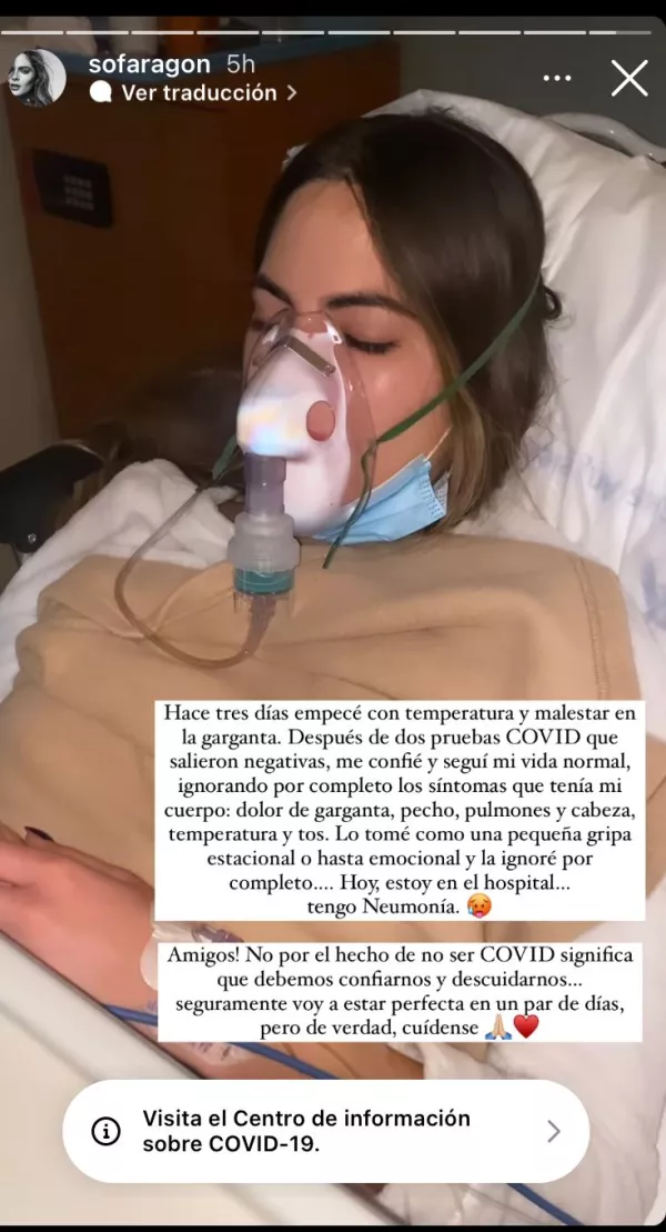 "Empecé con temperatura y malestar en la garganta. Después de dos horas pruebas covid que salieron negativas, me confié y seguí mi vida normal, ignorando por completo los síntomas que tenía mi cuerpo: dolor de garganta, pecho, pulmones y cabeza, temperatura y tos", indicó Sofía.