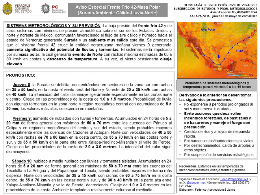 SISTEMAS METEOROLÓGICOS Y SU PREVISIÓN: La baja presión del frente frío 42 y de otros sistemas con mínimos de presión atmosférica sobre el sur de los Estados Unidos y norte y noreste de México, continuarán favoreciendo el flujo de aire cálido y húmedo hacia el estado de Veracruz generando Surada y un ambiente muy cálido este día. Se pronostica que el sistema frontal 42 cruce la entidad veracruzana mañana viernes 9 generando aumento significativo del potencial de lluvias y tormentas. El sistemas sería impulsado por su masa polar, la cual generaría evento de Norte con rachas máxima estimadas de 65 a 80 km/h en costas y descenso de temperatura. A su vez, el viento ocasionaría oleaje elevado.
