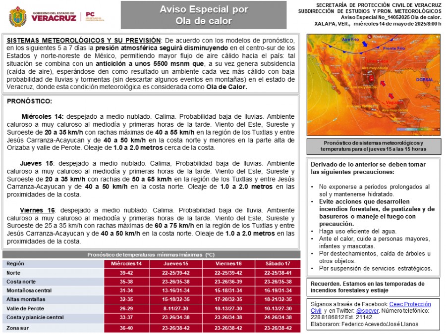 Miércoles 14: despejado a medio nublado. Calima. Probabilidad baja de lluvias. Ambiente caluroso a muy caluroso al mediodía y primeras horas de la tarde. Viento del Este, Sureste y Suroeste de 20 a 35 km/h con rachas máximas de 40 a 55 km/h en la región de los Tuxtlas y entre Jesús Carranza-Acayucan y de 40 a 50 km/h en la costa norte y menores en la parte alta de Orizaba y valle de Perote. Oleaje de 1.0 a 2.0 metros cerca de la costa.