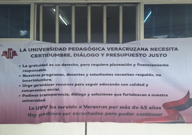 La mañana de jueves, amanecieron lonas colocadas en la entrada de las oficinas de la Universidad Pedagógica Veracruzana, con varias leyendas en las que se demanda   certidumbre, diálogo y la asignación de un presupuesto justo para la institución de educación superior.