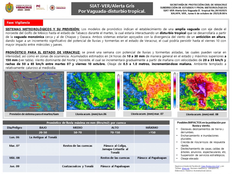 SISTEMAS METEOROLÓGICOS Y SU PREVISIÓN: Los modelos de pronóstico indican el establecimiento de una amplia vaguada con eje desde el noroeste del Golfo de México hasta el estado de Tabasco durante el martes, la cual estaría interactuando un disturbio tropical que se desarrollaría a partir de la vaguada monzónica cerca y al de Chiapas y Oaxaca. Ambos sistemas estarían apoyados con la divergencia del viento de un anticiclón en altura, dando lugar a un incremento significativo del potencial de lluvias y tormentas en el estado de Veracruz, el cual podría persistir hasta el viernes 10 con mayor impacto entre miércoles y jueves.