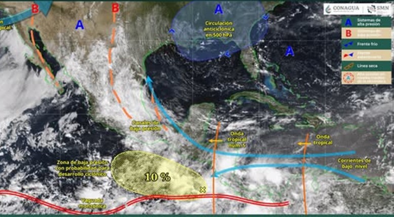 La Comisión Nacional del Agua informa que, para la tarde y noche del sábado, un nuevo sistema frontal puede ingresar al noroeste del Golfo de México, mismo que alcanzará la porción central de dicho golfo durante el domingo y se ubicará al norte de la península de Yucatán el lunes.