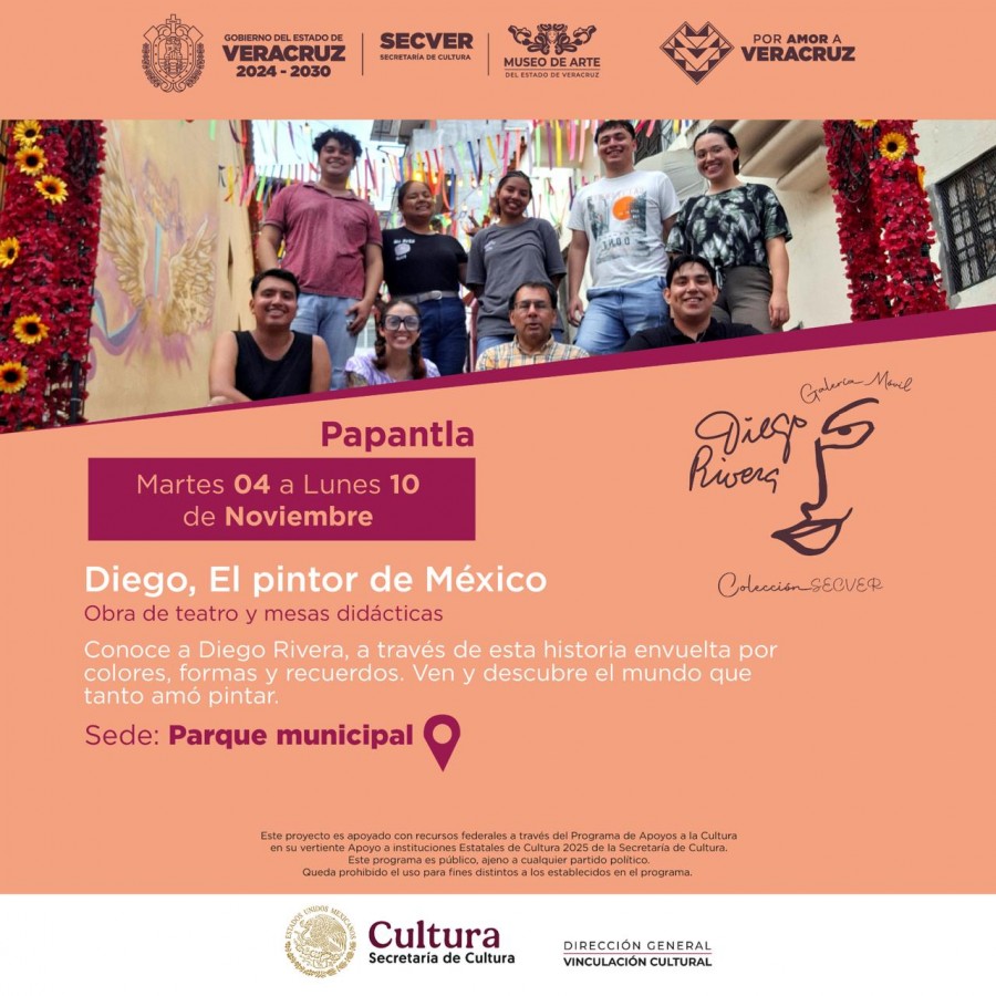 Xalapa, Ver., martes 04 de noviembre de 2025.- La Secretaría de Cultura de Veracruz (SECVER), en colaboración con el Ayuntamiento de Papantla, invita a conocer la Galería Móvil 2025: Diego Rivera, la muestra se expone en el parque municipal a partir de hoy y hasta el 10 de noviembre.