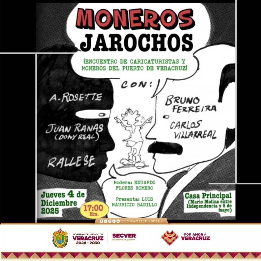 Veracruz, Ver., martes 02 de diciembre de 2025.- La Secretaría de Cultura de Veracruz (SECVER) invita al Encuentro de Ilustradores, Caricaturistas y Moneros del Puerto de Veracruz, el jueves 4 de diciembre, a las 17:00 horas, en el Centro Cultural Casa Principal, ubicado en el puerto de Veracruz. La entrada es libre.