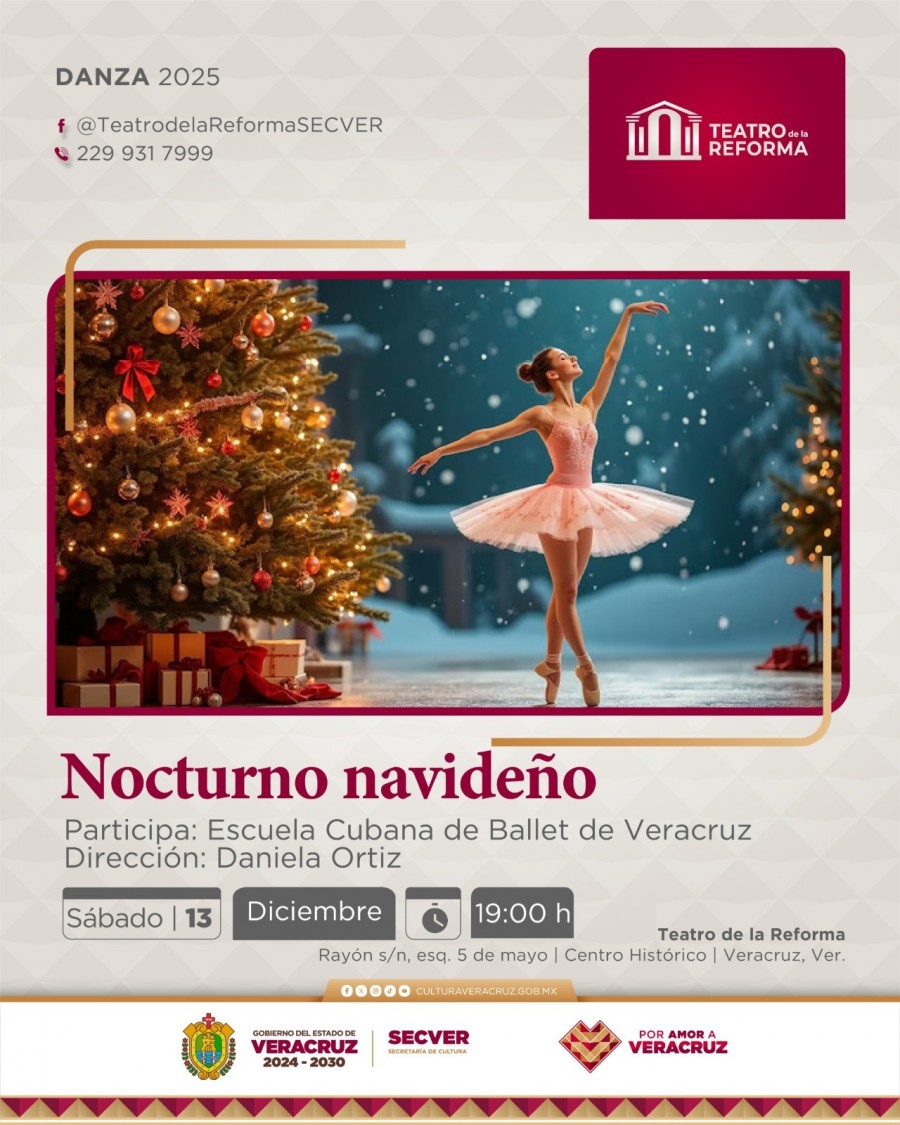 Xalapa, Ver., miércoles 10 de diciembre de 2025.- La Secretaría de Cultura de Veracruz (SECVER) invita al espectáculo de danza Nocturno Navideño, a cargo de la Escuela Cubana de Ballet de Veracruz (Escubaver), el sábado 13 de diciembre a las 19:00 horas en la Sala Principal del Teatro de la Reforma, en el puerto de Veracruz. La entrada es libre.