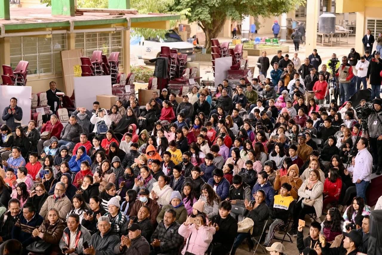 Durante su segunda visita al municipio en lo que va del año, explicó que, como respuesta a los daños provocados por las inundaciones de octubre pasado, el Estado entregó mil 633 kits escolares, 863 sillas, 432 mesas trapezoidales, 10 pupitres para personas zurdas, 158 cubetas de impermeabilizante, 98 cubetas de pintura, 74 pizarrones y 31 pantallas de 55 pulgadas para telesecundarias, así como 28 brochas y 28 rodillos.