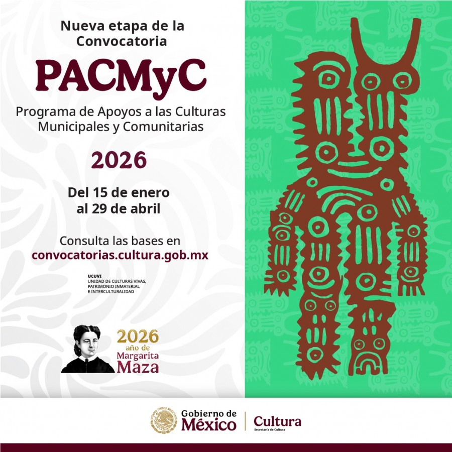 Participar en el PACMyC 2026 contribuye a continuar con la preservación de la riqueza cultural de nuestras regiones. Conoce las bases completas de la convocatoria en el enlace: https://convocatorias.cultura.gob.mx/vigentes/detalle/4020/pacmyc-2026.