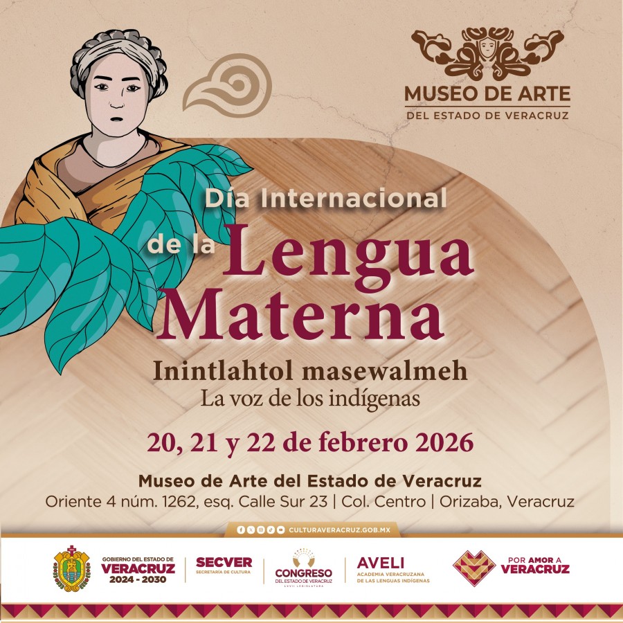Xalapa, Ver., miércoles 18 de febrero de 2026.- La Secretaría de Cultura de Veracruz (SECVER), en colaboración con el Congreso del Estado y la Academia Veracruzana de las Lenguas Indígenas (AVELI), invita a la jornada conmemorativa del Día Internacional de la Lengua Materna Inintlahtol masewalmeh: La voz de los indígenas, que se realizará del viernes 20 al domingo 22 de febrero en el Museo de Arte del Estado de Veracruz (MAEV), ubicado en Orizaba. Todas las actividades serán gratuitas.