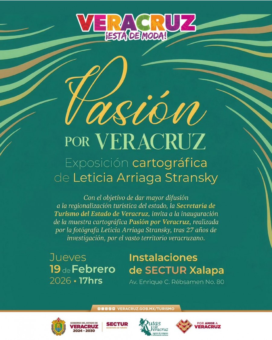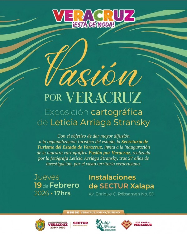 Xalapa, Ver., jueves 19 de febrero de 2026.- La Secretaría de Turismo (SECTUR) inaugurará este día, a las 17:00 horas, la exposición cartográfica Pasión por Veracruz, en sus instalaciones ubicadas en Enrique C. Rébsamen número 80, en Xalapa, como parte de una estrategia integral para fortalecer la promoción y el posicionamiento turístico del estado.