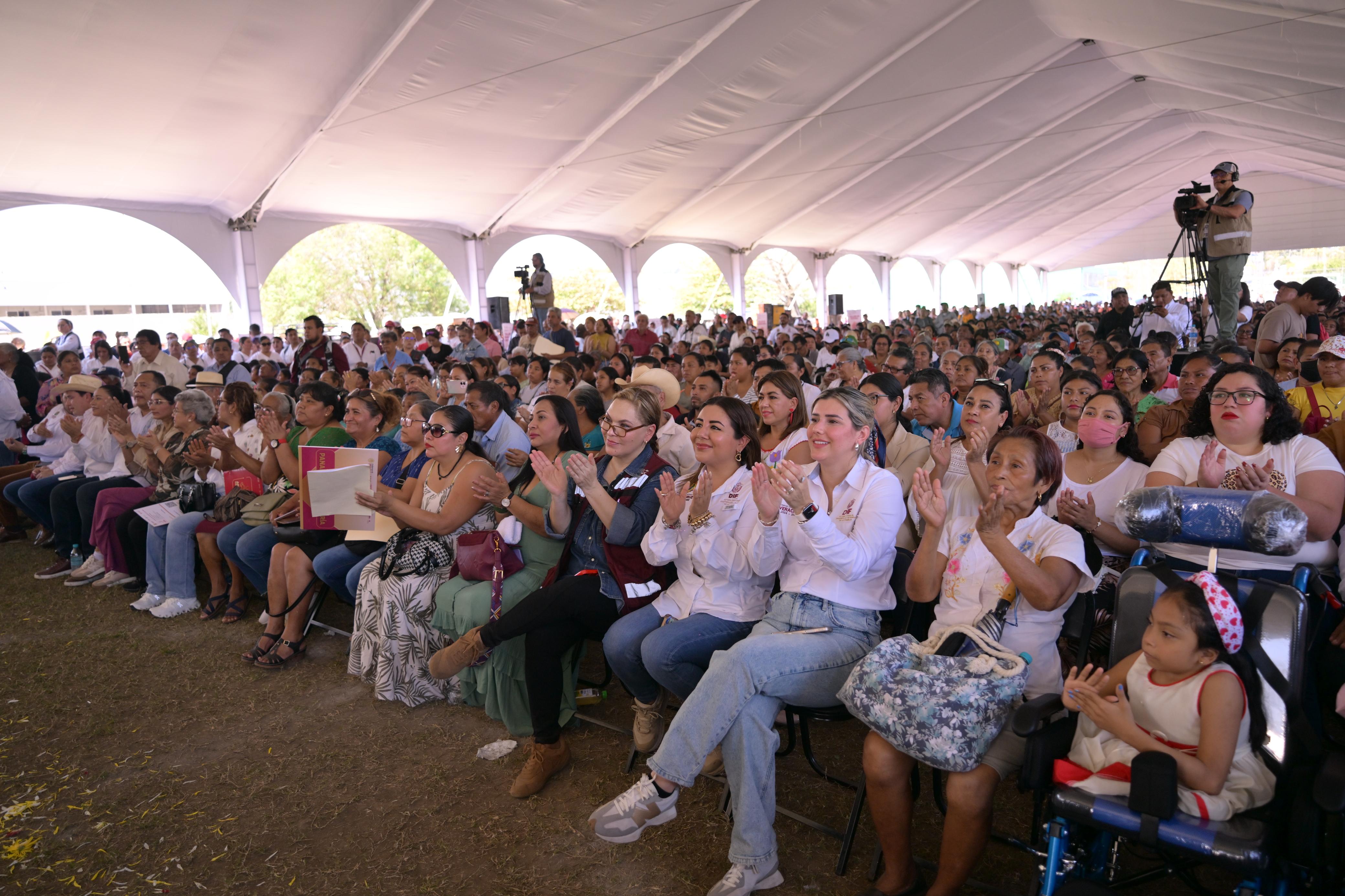 En la Unidad Deportiva ESBIO de San Andrés Tuxtla, la Mandataria encabezó el arranque y primera entrega de los programas Apoyo a la Palabra y Apoyo a la Familia, estrategia conjunta de la Secretaría de Desarrollo Social y el Sistema Estatal DIF que, en 2026, se extenderá a 112 municipios con una inversión global de 200 millones de pesos.
