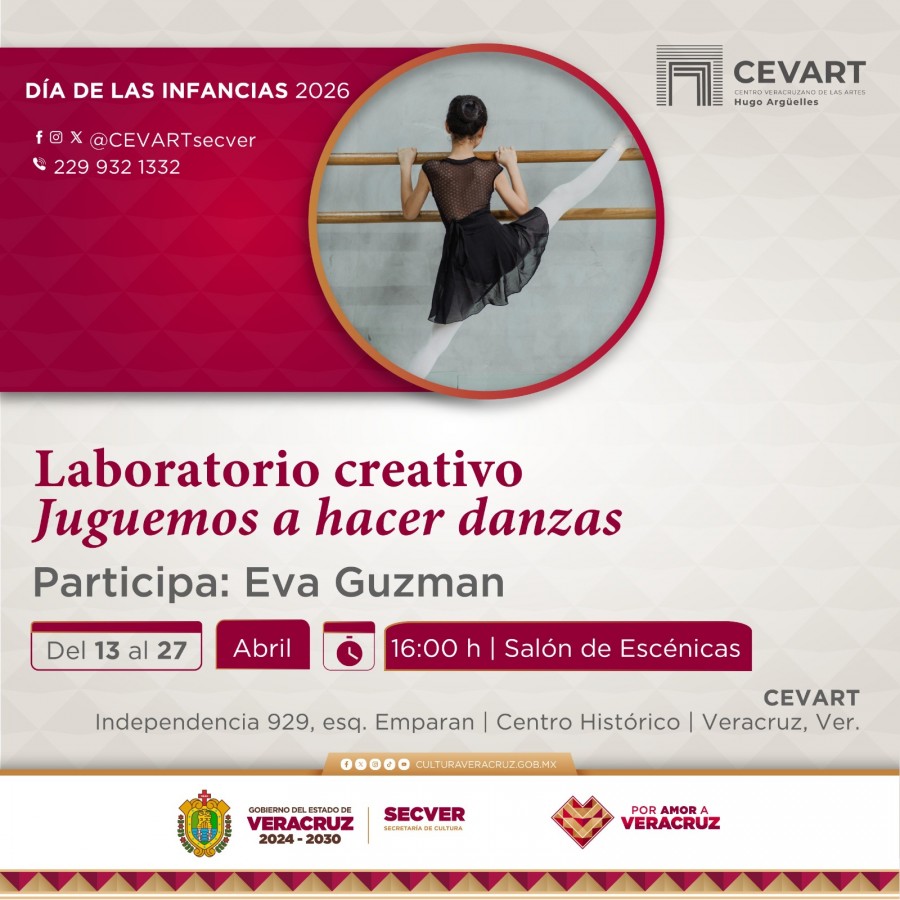 Xalapa, Ver., martes 07 de abril de 2026.- La Secretaría de Cultura de Veracruz (SECVER) invita a la serie de laboratorios creativos y seminarios en torno a la danza, que se llevarán a cabo en el Centro Veracruzano de las Artes Hugo Argüelles (CEVART), en la ciudad de Veracruz, en el marco del Día Internacional de la Danza. La entrada es libre.