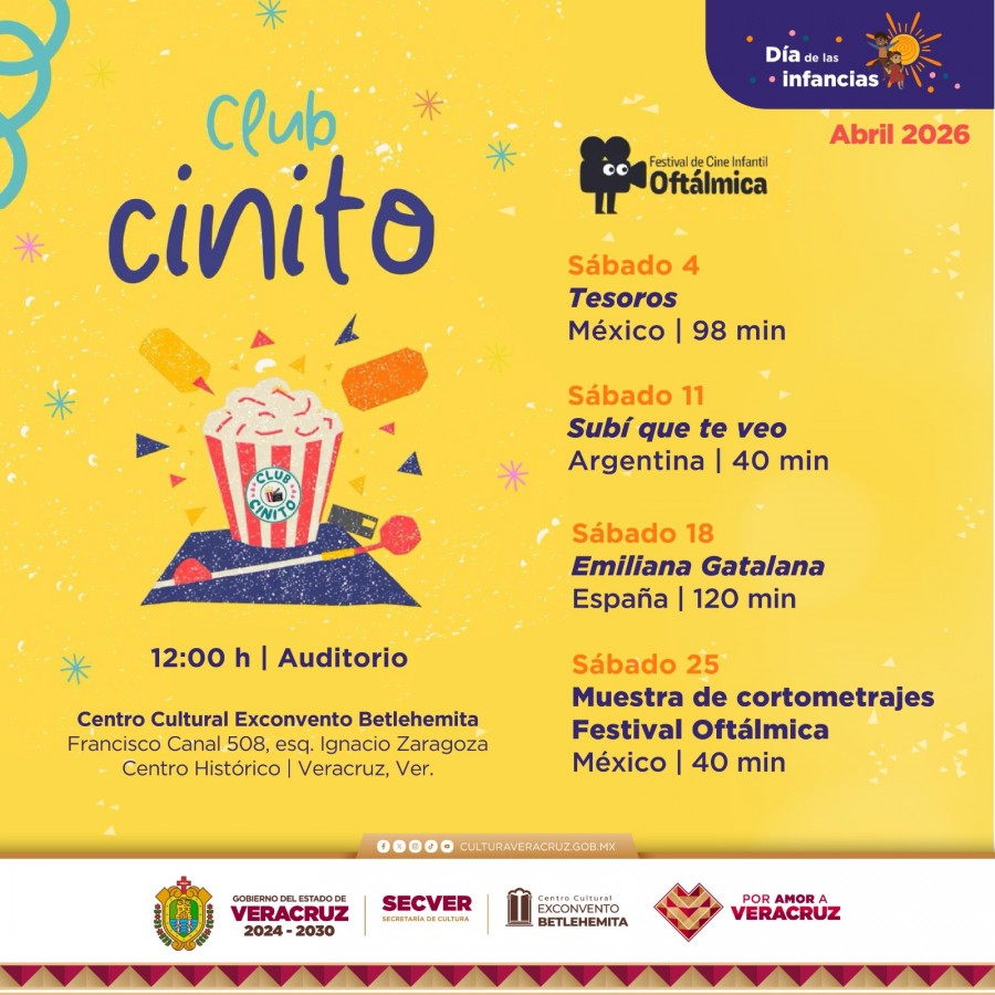 Xalapa, Ver., viernes 10 de abril de 2026.- La Secretaría de Cultura de Veracruz (SECVER), en colaboración con el Festival de Cine Infantil Oftálmica, invita a disfrutar del programa cinematográfico Club Cinito, que se realizará los sábados de abril en el Centro Cultural Exconvento Betlehemita, en Veracruz, en el marco del Día de las Infancias.