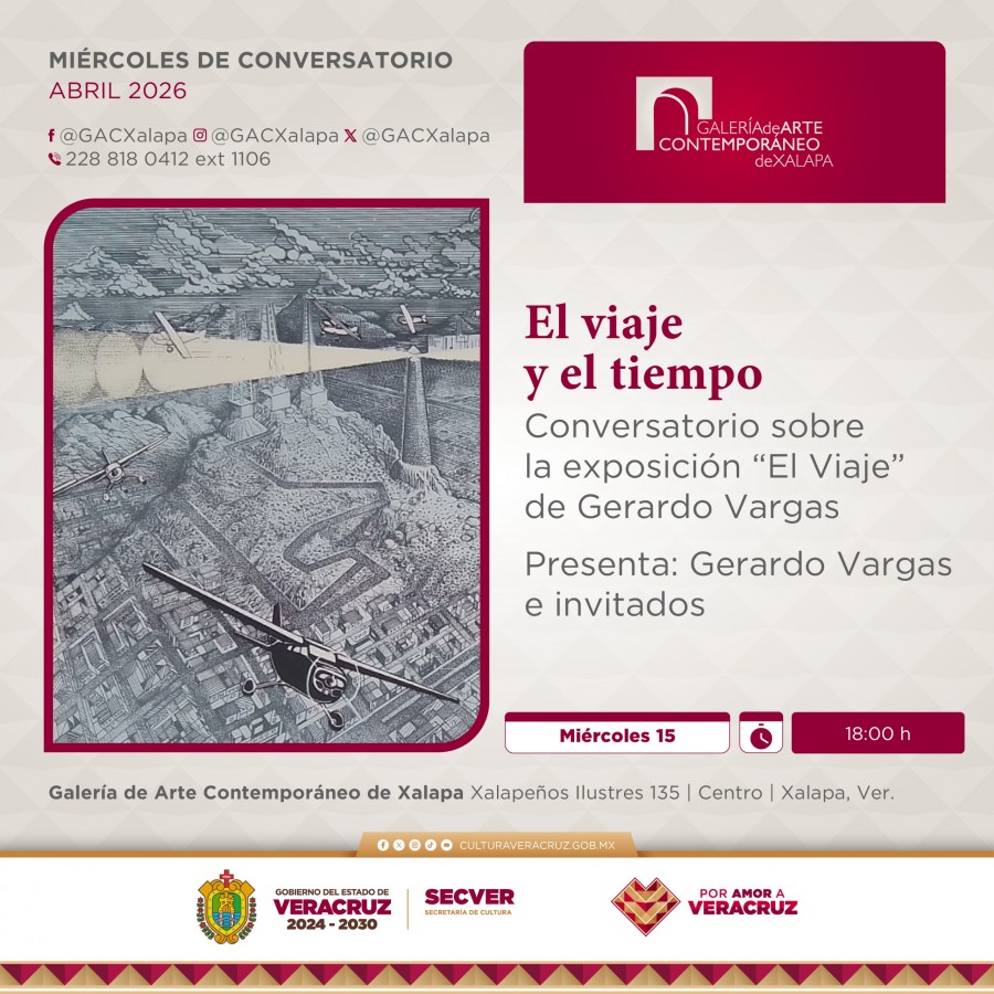 Xalapa, Ver., martes 14 de abril de 2026.- La Secretaría de Cultura de Veracruz (SECVER) invita al público en general al conversatorio El viaje y el tiempo, que se realizará mañana a las 18:00 horas en la Galería de Arte Contemporáneo de Xalapa (GACX). La entrada es gratuita.
