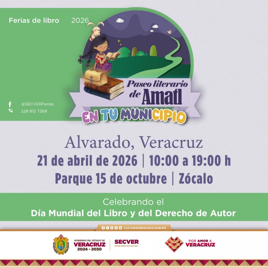 Xalapa, Ver., viernes 17 de abril de 2026.- La Secretaría de Cultura de Veracruz (SECVER), en colaboración con el Ayuntamiento de Alvarado, invita a participar en el Paseo literario de Amatl en tu municipio, el 21 de abril en el Parque 15 de Octubre, con actividades complementarias en la Plaza Cívica y el Casino Alvaradeño.