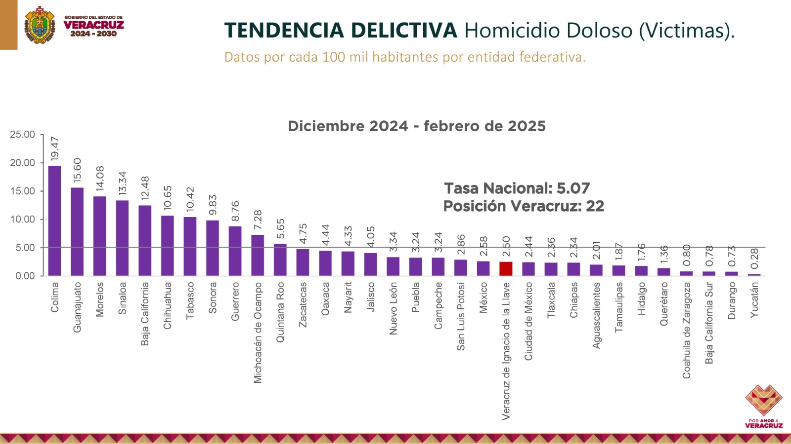 En cuanto al Homicidio Doloso, Veracruz está en la posición 22, con 5.07 homicidios dolosos por cada 100 mil habitantes.