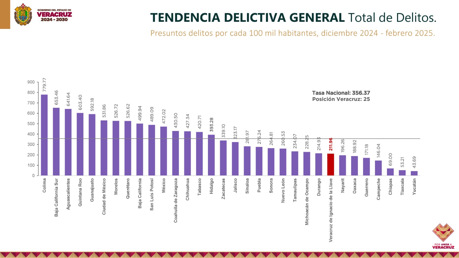 En cuanto al total de delitos por cada 100 mil habitantes, en el primer trimestre del presente gobierno Veracruz se ubicó en la posición 25, con 356.37 delitos por cada 100 mil habitantes. Mejor Que Veracruz solo están posicionados Nayarit, Oaxaca, Guerrero, Campeche, Chiapas, Tlaxcala y Yucatán.