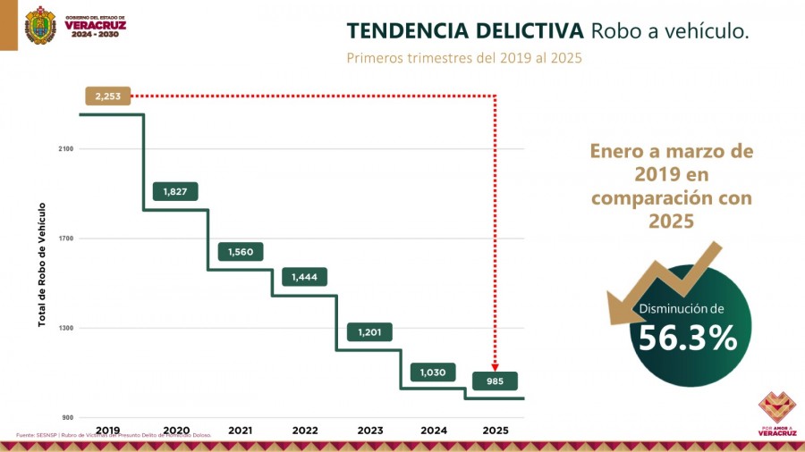 En la comparación del Estado con los anteriores gobiernos, esto es, del 2019, a la fecha, Veracruz ha avanzado muchísimo en el tema de seguridad. Por ejemplo, para el homicidio doloso ha habido una reducción del 50.7% en el primer trimestre de este gobierno, en comparación con el primer trimestre 2019. Del total de homicidios, el 44 % está relacionado con la delincuencia organizada y el narcomenudeo, mientras que el 56% a disputas por tierras, riñas, o el abuso de alcohol y drogas.