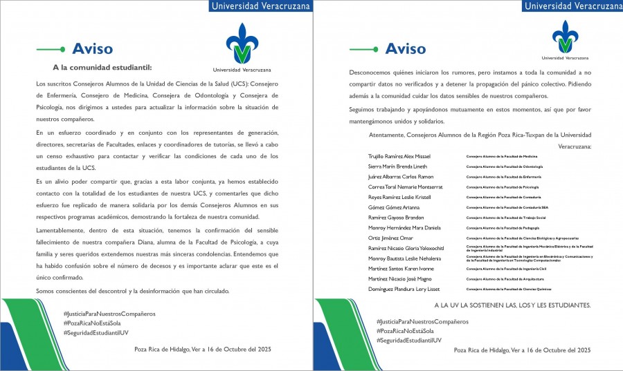 En memoria de nuestra compañera: Con profundo pesar, confirmamos el sensible fallecimiento de nuestra compañera Diana Jael Cuervo Santos, alumna de quinto semestre de la Facultad de Psicología. Extendemos nuestras más sinceras condolencias a su familia. Es importante recalcar que este es el único deceso confirmado.