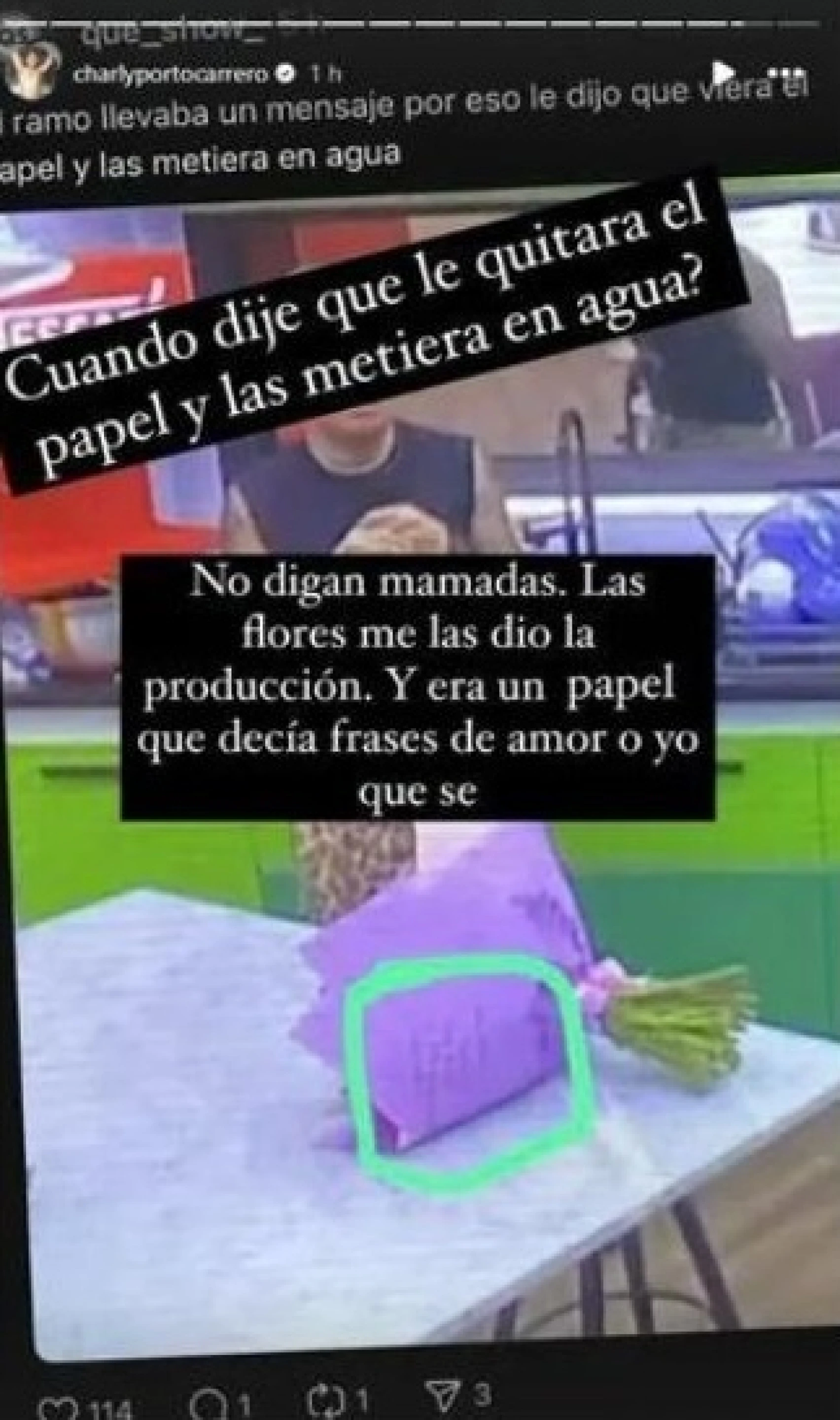 Además, en su visita Charly le llevó un ramo de flores y una bolsa con "detalles" para los demás habitantes, sin embargo, algunos de los seguidores del reality notaron que en la envoltura de las flores había una anotación que podría ser información de afuera.