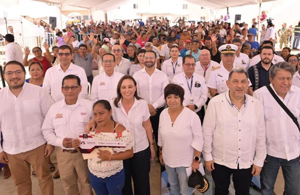 Sheinbaum y Nahle cumplen con familias reubicadas por el paso del Tren Interoceánico en Coatzacoalcos.