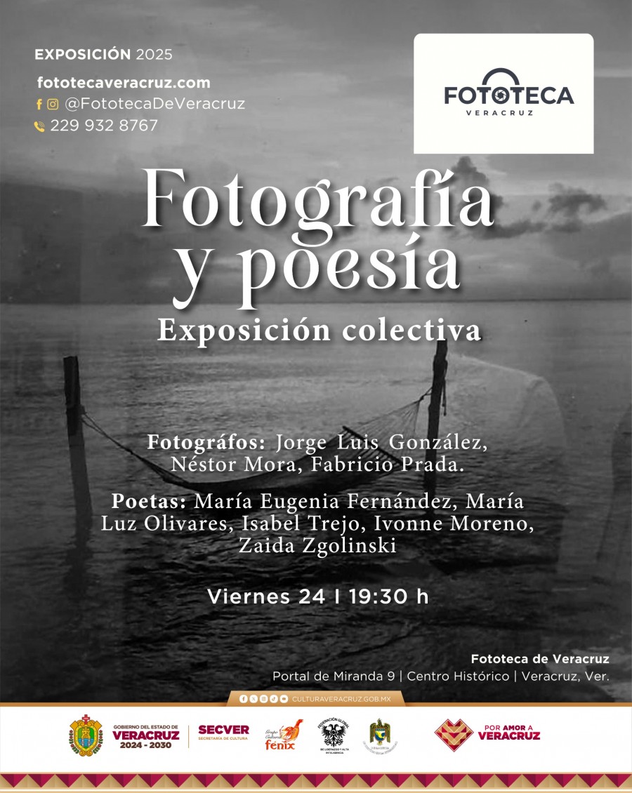 Xalapa, Ver., viernes 24 de octubre de 2025.- La Secretaría de Cultura de Veracruz (SECVER), en colaboración con el Grupo Cultural Fénix, la Federación Global de Liderazgo y Alta Inteligencia y la Academia Nacional de Historia y Geografía de la UNAM, invita a la inauguración de la exposición Fotografía y Poesía que se realizará  el día hoy a las 19:30 horas, en la Fototeca Veracruz. La entrada es gratuita.