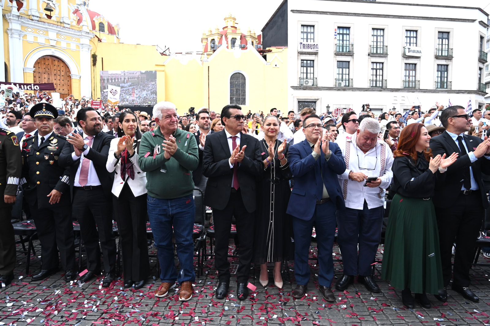 Xalapa, Ver., 30 de noviembre de 2025.- Diputadas y diputados de la LXVII Legislatura del estado, encabezados por la presidenta de la Mesa Directiva, Naomi Edith Gómez Santos, y por el presidente de la Junta de Coordinación Política (Jucopo), Esteban Bautista Hernández, acudieron a la ceremonia del Primer Informe de Gobierno de la gobernadora de Veracruz, Rocío Nahle García, realizado en la plaza Lerdo de la ciudad capital.