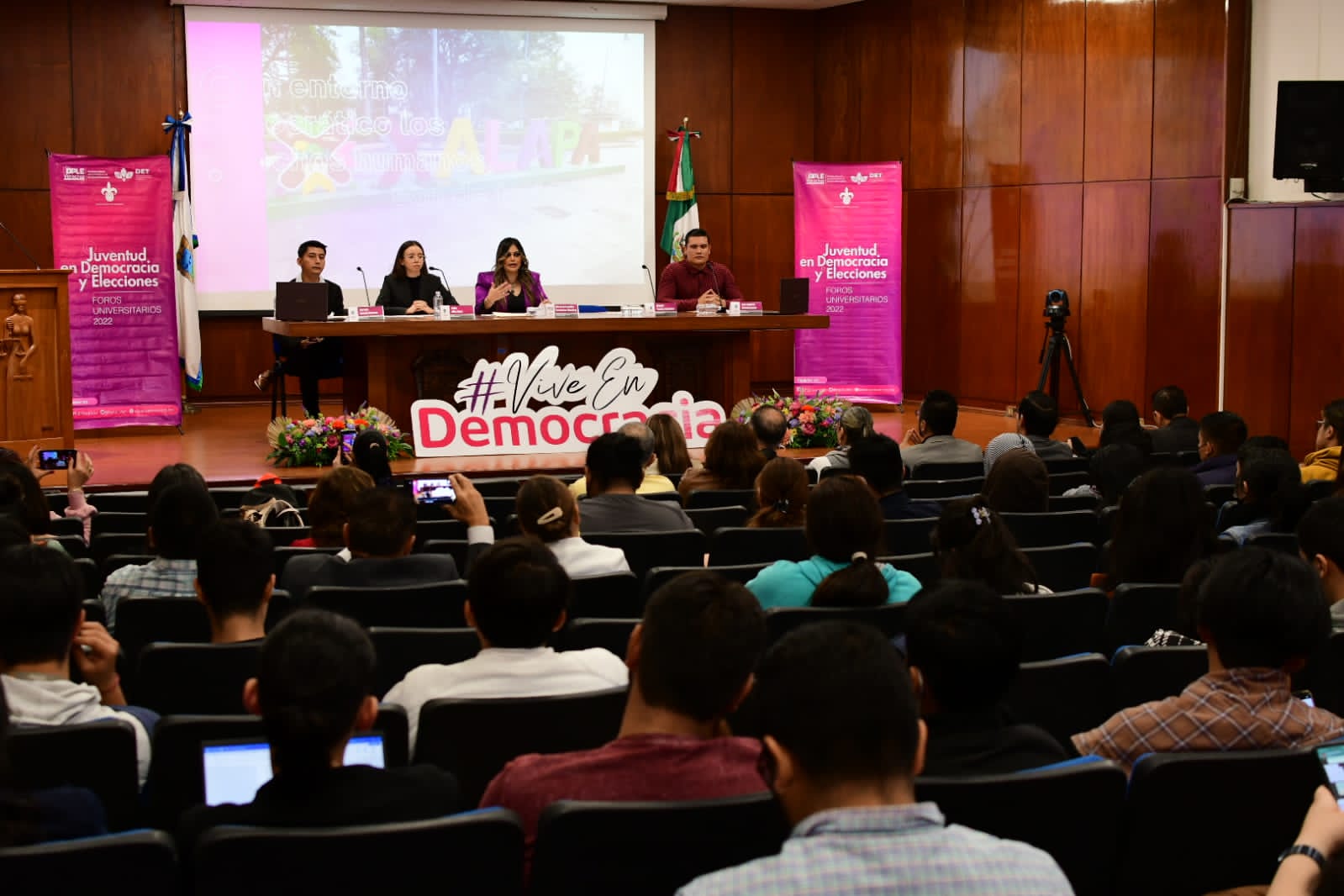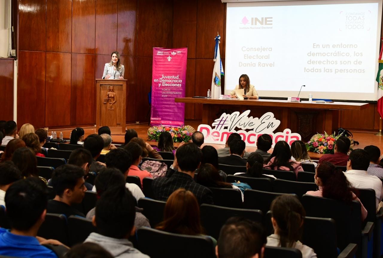En su participación, Margot Vargas Espinosa, estudiante de la Licenciatura en Antropología Social de la UV, aseguró que las juventudes pueden ser agentes de cambios y uno de los obstáculos que enfrentan las juventudes -específicamente los sectores marginados quienes se enfrentan al obstáculo de desconocer sus derechos para poder ejercerlos. Como segunda etapa, se desarrolló la Charla Reflexiva a cargo de la Consejera del Instituto Nacional Electoral (INE), Dania Paola Ravel Cuevas, la cual presentó la Consejera Presidenta del OPLE Veracruz, Marisol Alicia Delgadillo Morales. Durante su exposición, la Consejera del INE se refirió a las Acciones Afirmativas en materia Político-Electoral para que personas de grupos vulnerables puedan ejercer su derecho al voto o poder trabajar en algún cargo de elección popular. Agregó que desde el INE les corresponde vigilar que se respeten los derechos político-electorales como: La libertad de asociación, el derecho a reunirse, el derecho a votar, derecho de ser votado o votada. Durante las conclusiones, Consejera Presidenta del OPLE Veracruz coincidió que se debe establecer la relación entre democracia y derechos humanos para enfrentar grandes retos actuales como el desencanto de la ciudadanía por las instituciones. La Consejera Electoral, María de Lourdes Fernández Martínez refirió que este esfuerzo de la Comisión Especial Para la Promoción de la Cultura Democrática tuvo como objetivo visibilizar a las juventudes como agentes de cambio, dándoles voz para ser escuchados y que sus opiniones se tomen en cuenta.