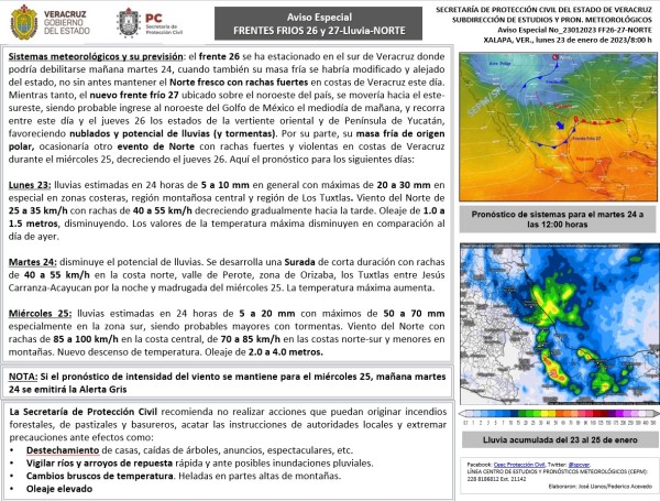 Sistemas meteorológicos y su previsión: el frente 26 se ha estacionado en el sur de Veracruz donde podría debilitarse mañana martes 24, cuando también su masa fría se habría modificado y alejado del estado, no sin antes mantener el Norte fresco con rachas fuertes en costas de Veracruz este día. Mientras tanto, el nuevo frente frío 27 ubicado sobre el noroeste del país, se movería hacia el este-sureste, siendo probable ingrese al noroeste del Golfo de México el mediodía de mañana, y recorra entre este día y el jueves 26 los estados de la vertiente oriental y de Península de Yucatán, favoreciendo nublados y potencial de lluvias (y tormentas). Por su parte, su masa fría de origen polar, ocasionaría otro evento de Norte con rachas fuertes y violentas en costas de Veracruz durante el miércoles 25, decreciendo el jueves 26. Aquí el pronóstico para los siguientes días: Lunes 23: lluvias estimadas en 24 horas de 5 a 10 mm en general con máximas de 20 a 30 mm en especial en zonas costeras, región montañosa central y región de Los Tuxtlas. Viento del Norte de 25 a 35 km/h con rachas de 40 a 55 km/h decreciendo gradualmente hacia la tarde. Oleaje de 1.0 a 1.5 metros, disminuyendo. Los valores de la temperatura máxima disminuyen en comparación al día de ayer. Martes 24: disminuye el potencial de lluvias. Se desarrolla una Surada de corta duración con rachas de 40 a 55 km/h en la costa norte, valle de Perote, zona de Orizaba, los Tuxtlas entre Jesús Carranza-Acayucan por la noche y madrugada del miércoles 25. La temperatura máxima aumenta. Miércoles 25: lluvias estimadas en 24 horas de 5 a 20 mm con máximos de 50 a 70 mm especialmente en la zona sur, siendo probables mayores con tormentas. Viento del Norte con rachas de 85 a 100 km/h en la costa central, de 70 a 85 km/h en las costas norte-sur y menores en montañas. Nuevo descenso de temperatura. Oleaje de 2.0 a 4.0 metros. NOTA: Si el pronóstico de intensidad del viento se mantiene para el miércoles 25, mañana martes 24 se emitirá la Alerta Gris |