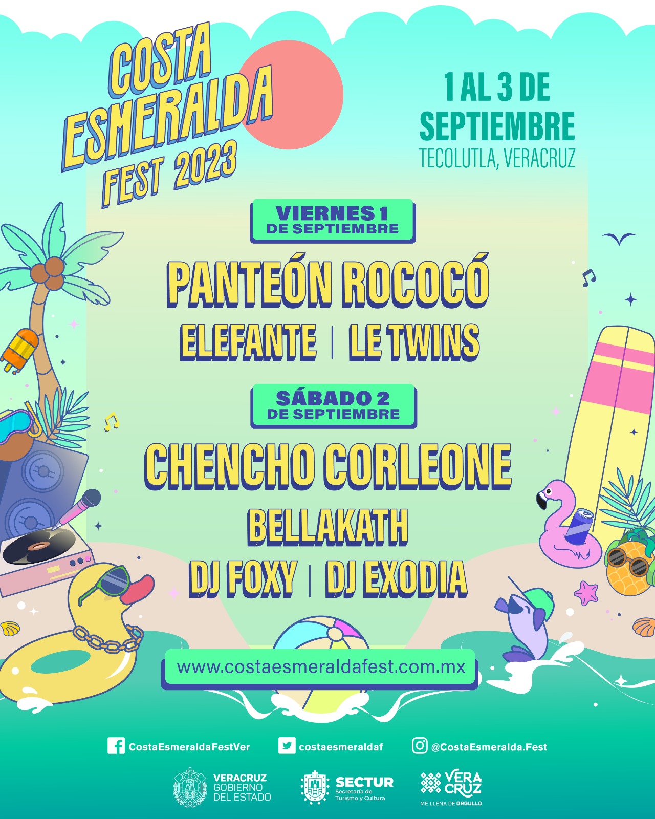 Xalapa, Ver., 11 de agosto de 2023.- Tras realizar la invitación al Costa Esmeralda Fest en la Ciudad de México y Puebla, la Secretaría de Turismo y Cultura (SECTUR) dio a conocer a los habitantes de Tecolutla y la región el programa de actividades a realizarse del 01 al 03 de septiembre. Uno de los principales atractivos será el pabellón gastronómico y artesanal en el que intervendrán representantes de 16 municipios; en el mismo espacio repetirá el foro cultural y los conciertos con artistas locales. Cabe recordar el acceso gratuito a la nueva sede y las más de 50 actividades entre recreativas, acuáticas, artesanales, gastronómicas, de naturaleza y educativas, así como el Torneo de Voleibol de playa, antesala del mundial que tendrá lugar en Tlaxcala del 05 al 15 de octubre. El inicio de los conciertos está previsto a las 20:00 horas del viernes 01 con Le Twins, Elefante y Panteón Rococó, además de DJ Exodia, Bellakath & DJ Foxy y Chencho Corleone, el sábado 02 de septiembre.
