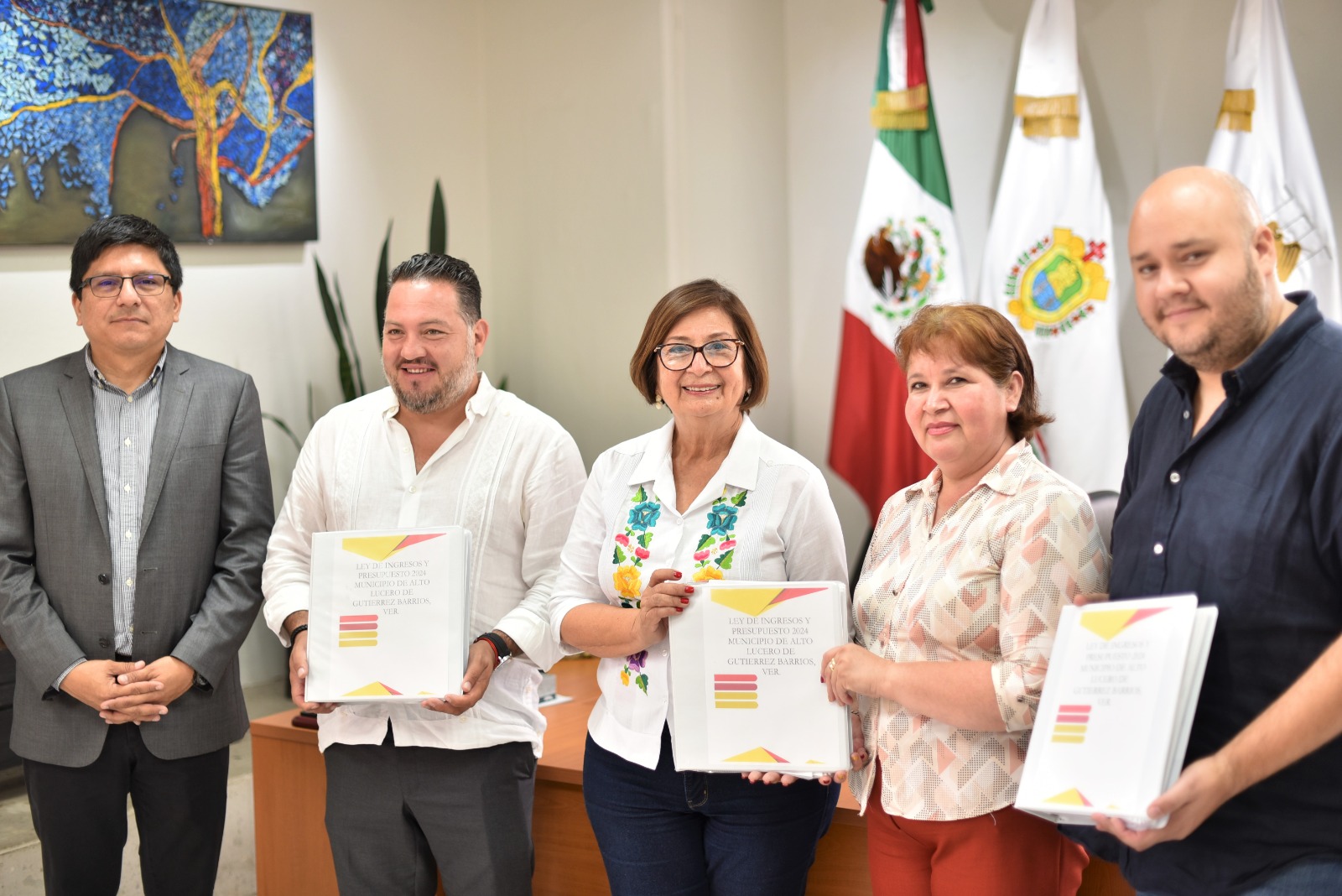 El Congreso del Estado de Veracruz, por conducto de su presidenta, diputada Margarita Corro Mendoza, dio inicio a la recepción de los proyectos de Leyes de Ingreso y Presupuesto de Egresos de los Ayuntamientos de la entidad, conforme a lo dispuesto por el artículo 107 de la Ley Orgánica del Municipio Libre. La legisladora Margarita Corro recibió del presidente municipal Luis Vicente Aguilar Castillo el proyecto de Ley de Ingresos y Presupuesto de Egresos 2024 del ayuntamiento de Alto Lucero de Gutiérrez Barrios; lo acompañaron la síndica, Celia Herrera Sánchez y el regidor segundo, Jorge Rivera Castillo. Posteriormente y con la presencia del secretario de Fiscalización del Congreso local, Everardo Domínguez Landa, la representante popular felicitó a los ediles por ser de los primeros en cumplir con la legislación vigente en materia de planeación, "la adecuada integración de este documento permite a los gobiernos visualizar metas y objetivos de gran beneficio para la población", puntualizó. El Artículo 107 de la Ley Orgánica del Municipio Libre señala que en el curso de la segunda quincena del mes de septiembre de cada año, los ayuntamientos remitirán por triplicado, al Congreso del Estado, el proyecto anual de ley de ingresos y el Presupuesto de Egresos. En caso de que aquel haga observaciones, las comunicará al Ayuntamiento a más tardar el 30 de octubre. Si no cumpliera con la remisión, el Congreso tendrá por presentados los proyectos del año anterior y podrán ajustarlos en la medida que estime necesario.
