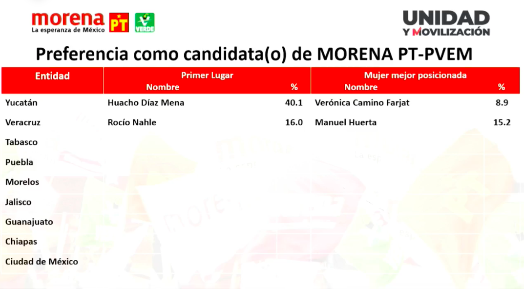 Finalmente, tomando en consideración también a quién consideran el mejor candidato/a, Rocío Nahle queda mejor ubicada con un 16 por ciento y Manuel Huerta queda en segundo lugar con el 15.2 por ciento, y este es el que finalmente determinará quién encabeza la Coordinación.