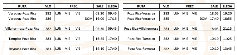 ![]() 4 vuelos conectarán a Poza Rica con Villahermosa, Reynosa, Veracruz puerto y Tampico / |