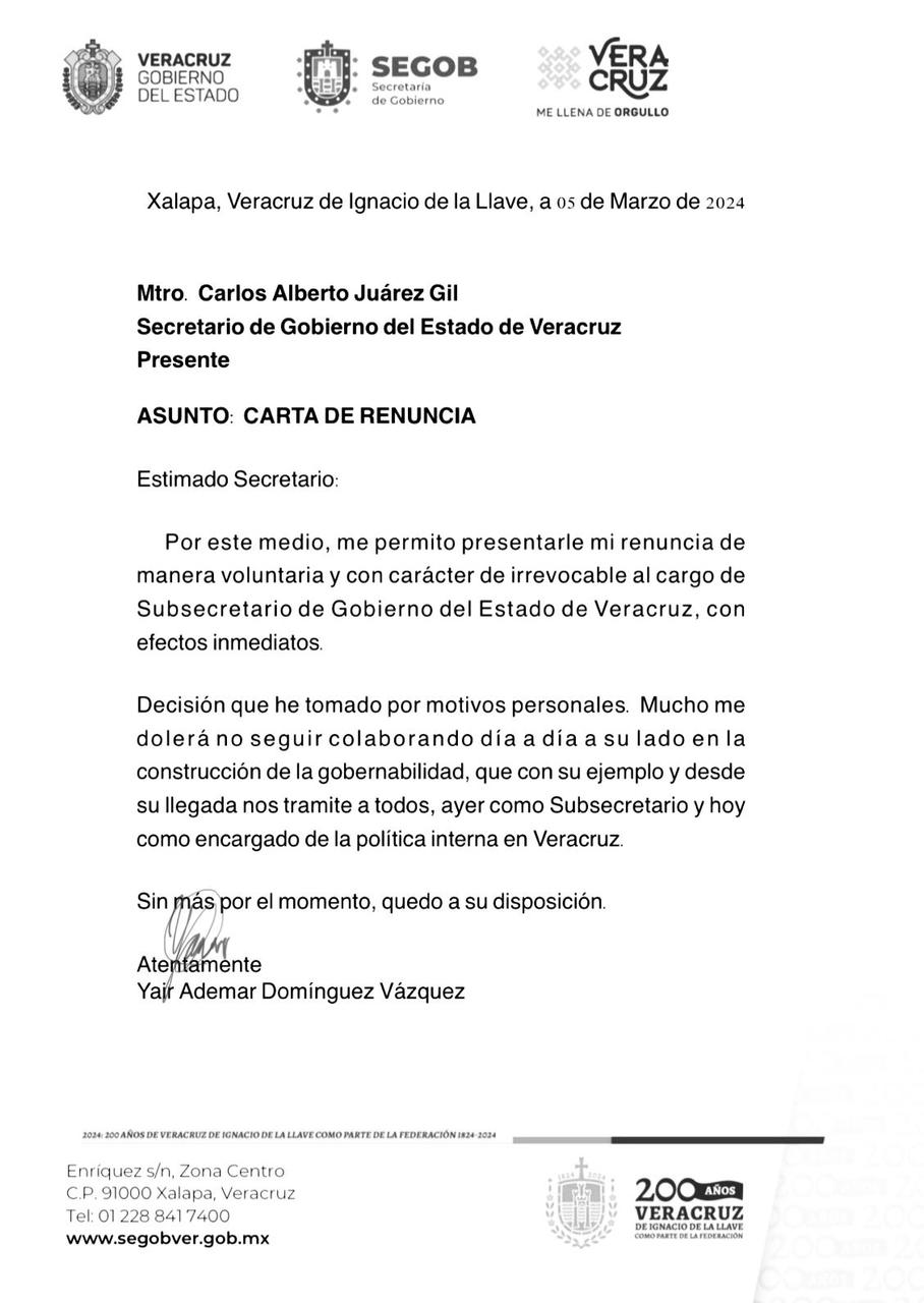 Esta mañana circularon un documento de renuncia supuestamente firmado por el Subsecretario de Gobierno del Estado de Veracruz, Yair Ademar Domínguez Vázquez, dirigido al Maestro Carlos Alberto Juárez Gil, en el que supuestamente el Subsecretario le presenta su renuncia por motivos personales con carácter de irrevocable y con efectos inmediatos. Vaya, que hasta el documento de renuncia fue circulado, pero Yair Ademar afirmó a Política al Día Express, que el documento es apócrifo y no es su firma.