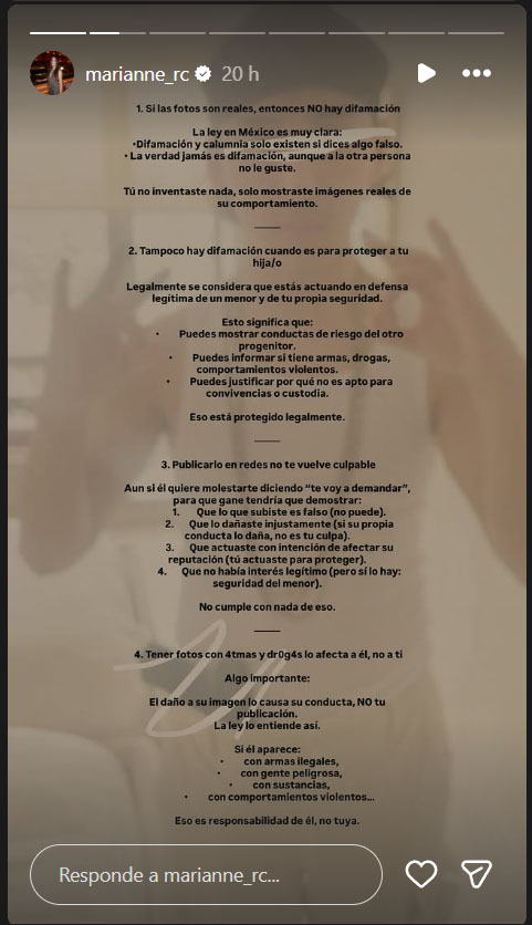 La influencer Marianne Gonzaga volvió a pronunciarse públicamente sobre el conflicto legal que enfrenta con su expareja, José Saíd Becerril, padre de su hija, por la custodia de la pequela Emma. Esto ocurre después de que la familia paterna en una entrevista televisiva lanzó advertencias sobre posibles acciones legales en su contra debido a sus declaraciones públicas y al proceso de custodia. En respuesta, la creadora de contenido publicó un manifiesto dividido en cuatro puntos a través de sus historias de Instagram, donde defendió su derecho a hacer públicas las acusaciones que previamente había expuesto. Hace unos días, Gonzaga afirmó que su expareja buscaba nuevamente quitarle la guarda y custodia de su hija, acusándolo además de posar con armas y de presunto consumo de sustancias. En su mensaje, la influencer insistió en que sus declaraciones no constituyen difamación si están basadas en hechos verificables. En su primer punto escribió: "Si las fotos son reales entonces no es difamación. La verdad jamás es difamación, aunque a la otra persona no les guste." Posteriormente, Gonzaga señaló que actuar para proteger a un menor descarta la intención de dañar reputaciones. Sobre ello afirmó: "No hay difamación cuando es para proteger a tu hija/o." La influencer enmarcó su postura como un acto de legítima defensa materna ante lo que considera riesgos para el bienestar de Emma. En su tercer argumento, la creadora digital subrayó que el hecho de publicar información en redes sociales no la convierte en culpable de un delito, aun cuando existan advertencias o presiones legales. Escribió: "Publicarlo en redes no te vuelve culpable", y agregó que para que exista difamación deben comprobarse tres elementos: que la acusación sea falsa, que exista intención de dañar y que no haya interés legítimo detrás. Por último, recalcó que todas sus acciones han tenido como fin la protección de su hija y que su interés principal es salvaguardar su integridad y seguridad.