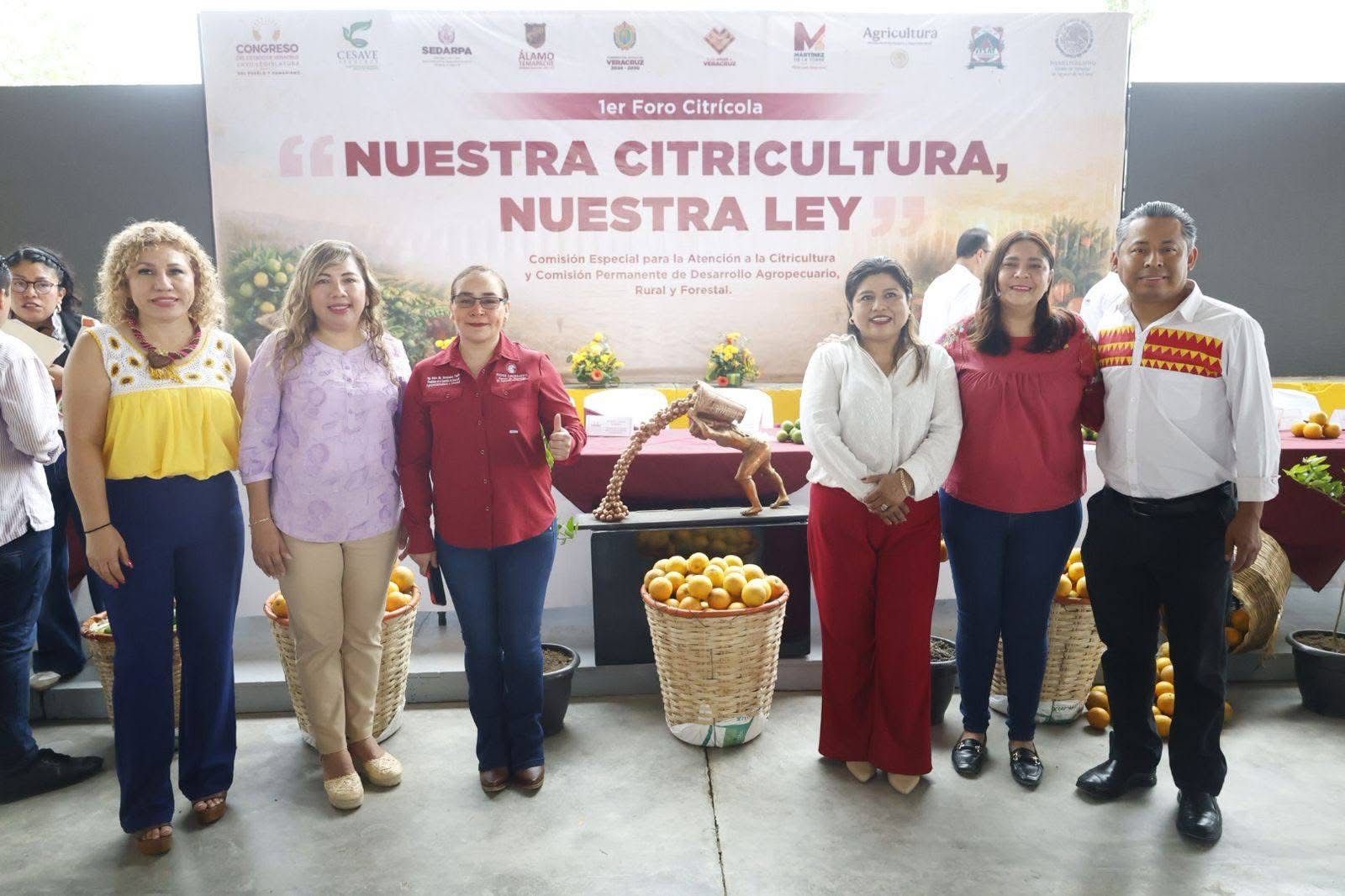 Xalapa, Ver., 27 de febrero de 2026.- Con la participación de productoras y productores de cítricos de la región, en el municipio de Álamo Temapache se realizó el primer foro Nuestra citricultura, nuestra ley, impulsado y coordinado por la presidenta de la Comisión Especial para la Atención a la Citricultura del Congreso del Estado de Veracruz, diputada Imelda Garrido Alvarado. A este foro asistieron el legislador Urbano Bautista Martínez y la diputada Liud Herrera Félix, secretario y vocal, respectivamente, de la citada instancia; las legisladoras Miriam García Guzmán, Dulce María Hernández Tepole y Laura Nallely Mejía Larios; el diputado Facundo Fernández de la Cruz; el presidente municipal de Álamo Temapache, José Roberto Arenas Martínez, el subsecretario de Desarrollo Agrícola Raúl Gámez González; además de representantes de dependencias estatales y federales.