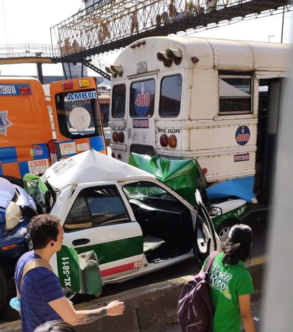 Taxista salva la vida, su unidad quedó prensada entre camioneta y camión de pasaje.