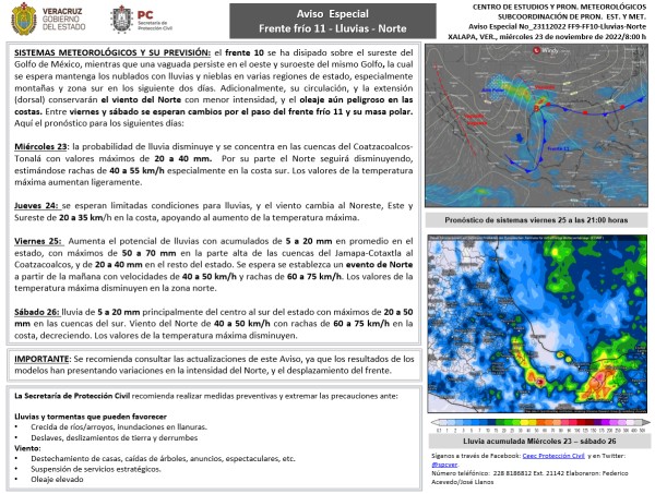 Población veracruzana: Aviso Especial por frente frío-Lluvia-Norte