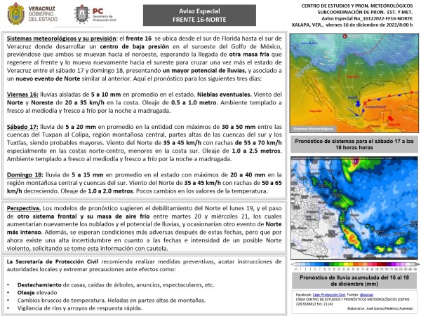 Población veracruzana: Aviso Especial por Surada-Frente frío-Norte