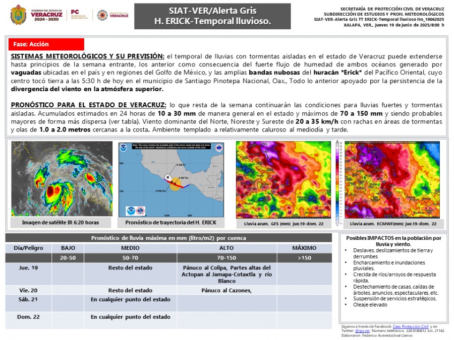 SISTEMAS METEOROLÓGICOS Y SU PREVISIÓN: el temporal de lluvias con tormentas aisladas en el estado de Veracruz puede extenderse hasta principios de la semana entrante, los anterior como consecuencia del fuerte flujo de humedad de ambos océanos generado por vaguadas ubicadas en el país y en regiones del Golfo de México, y las amplias bandas nubosas del huracán Erick del Pacífico Oriental, cuyo centro tocó tierra a las 5:30 h de hoy en el municipio de Santiago Pinotepa Nacional, Oax., Todo lo anterior apoyado por la persistencia de la divergencia del viento en la atmósfera superior.