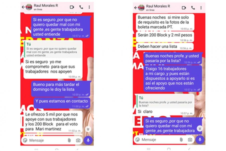 En una de las presuntas conversaciones obtenidas a través de captura de pantalla por quienes se quejan del caso el mencionado profesor Raúl Morales señala: “buenas noches, sí mire, solo de requisito es las fotos de la boleta marcada PT, serán 200 block y 2 mil pesos”, a lo que su interlocutor señala: “buenas noches profe, ¿y usted pasaría por la lista? Traigo 16 trabajadores a mi cargo, y pues están dispuestos a apoyarlo si es así el apoyo que nos está ofreciendo… si es seguro, porque no quiero quedar mal con mi gente”.