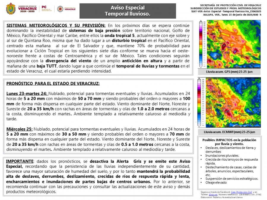 Se desactiva la #AlertaGris del #SIAT_VER y se emite #AvisoEspecial por temporal lluvioso |