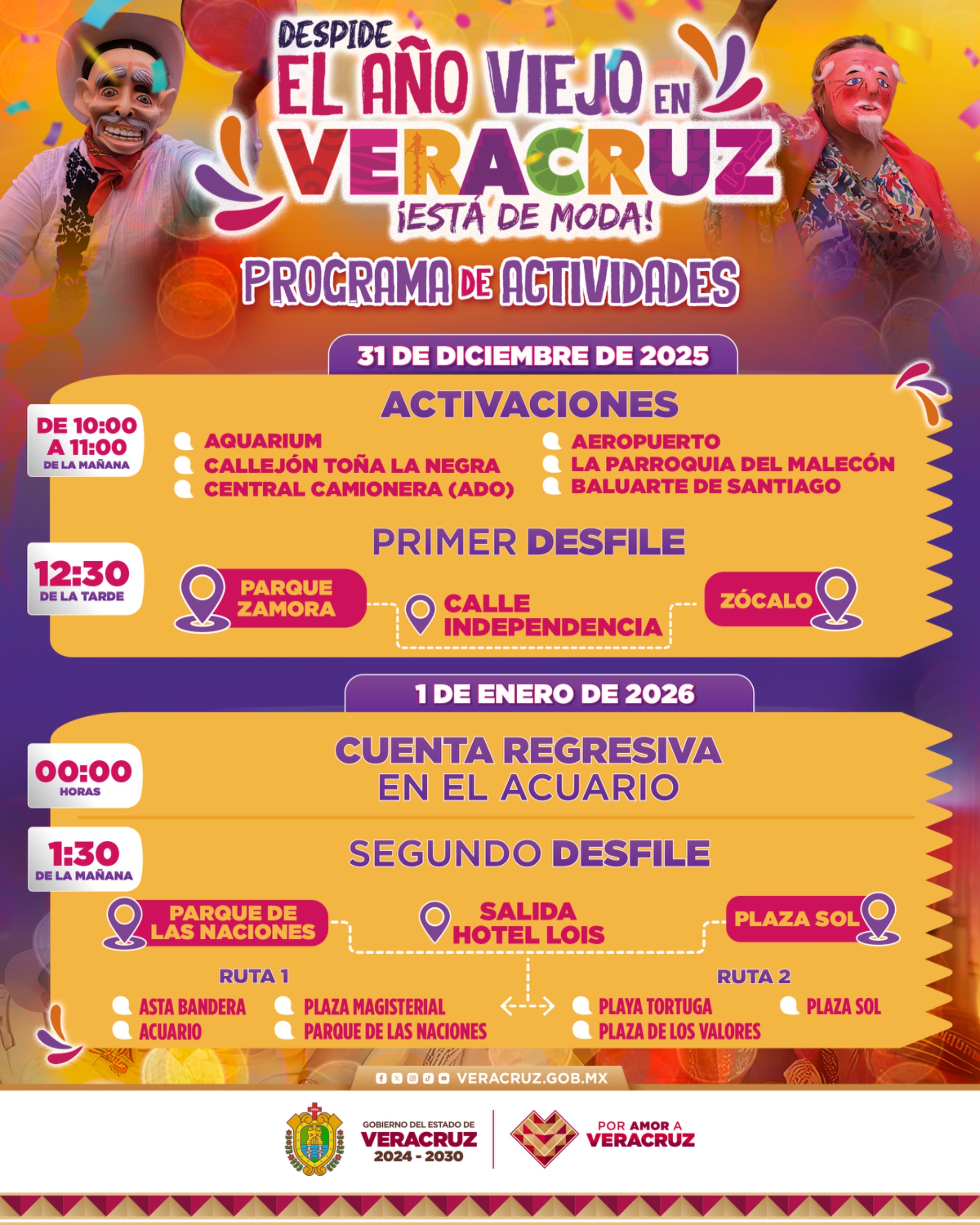 Para la celebración de la media noche, la Plaza del Heroísmo recibirá a la Compañía de Ópera y Grupo de Son Jarocho El Cenzontle, así como a Los Internacionales Váskez, a partir de las 00:30 horas. En ese mismo horario, la Plaza Magisterial contará con un elenco integrado por la Orquesta SL, un DJ y la música del Camarón y sus Teclados.