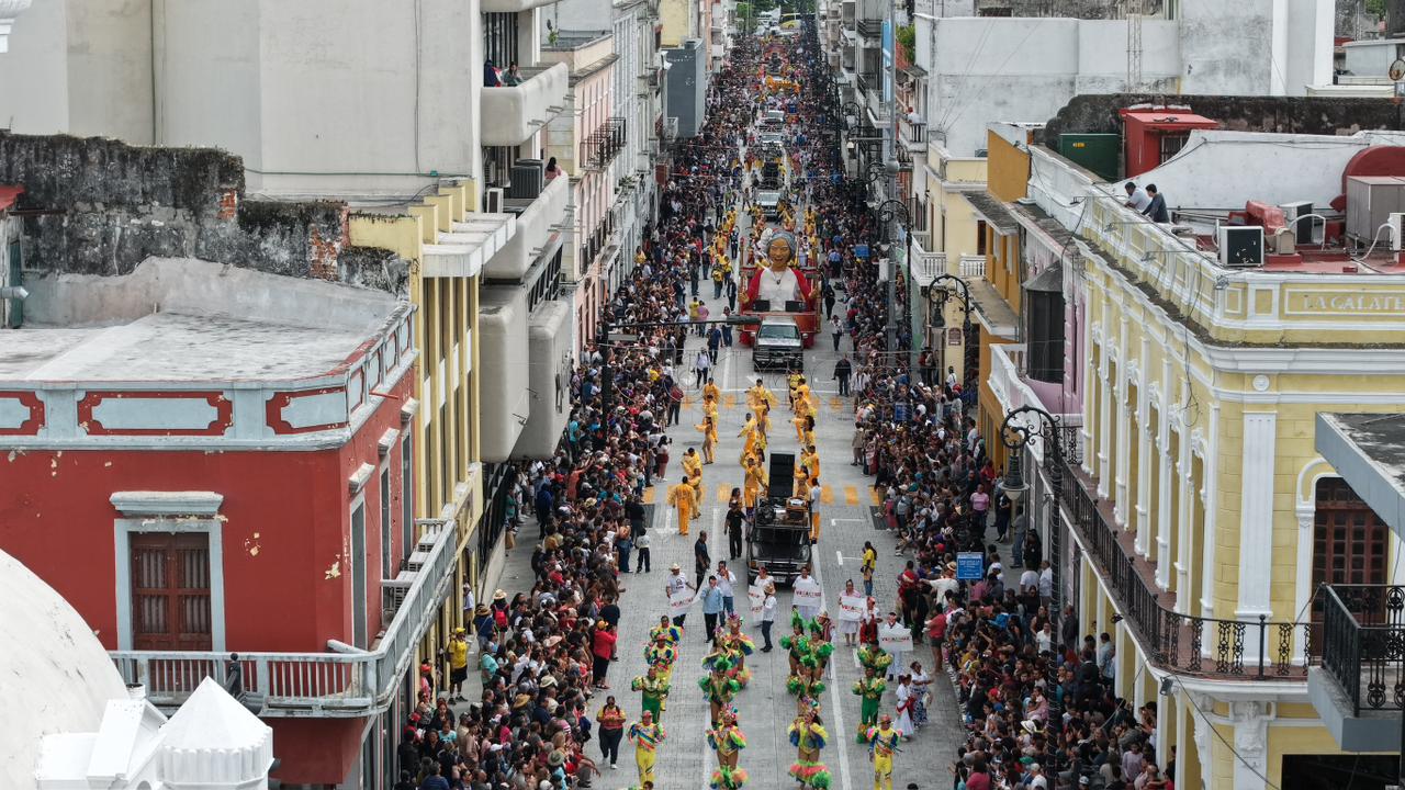 Veracruz, Ver., miércoles 31 de diciembre de 2025.- Entre la algarabía que caracteriza al pueblo jarocho y en la tierra que dio origen a la tradición de El Viejo, dio inicio el primer desfile Despide el Año Viejo en Veracruz, encabezado por una de las tres figuras monumentales que conformaron el contingente.