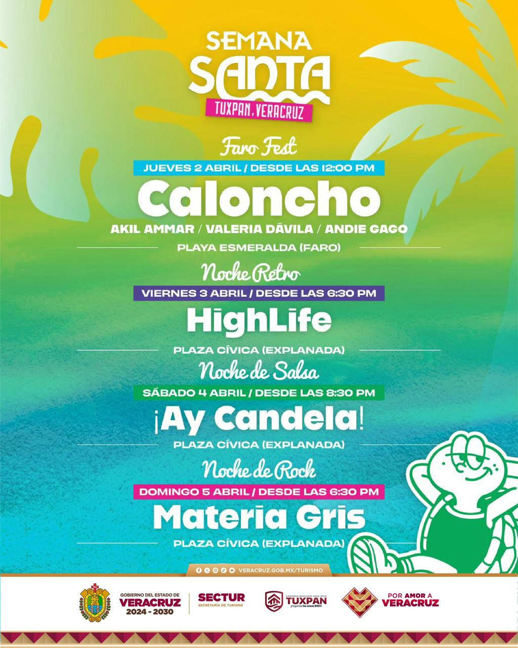 Xalapa, Ver., miércoles 01 de abril de 2026.– Tuxpan ofrecerá, del 02 al 5 de abril, eventos musicales y actividades recreativas en distintos espacios públicos, con la participación de Caloncho, Highlife, ¡Hay Candela! y Materia Gris, posicionándose como uno de los destinos de playa más accesibles desde la Ciudad de México, a aproximadamente 3 horas con 45 minutos.