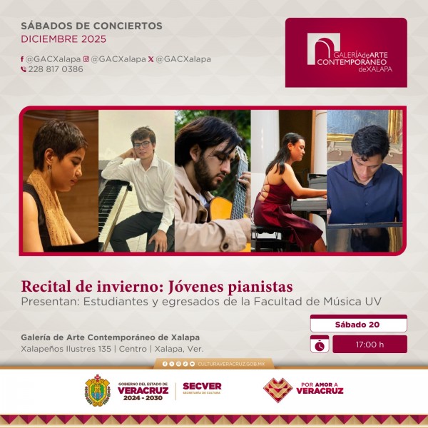 Xalapa, Ver., viernes 12 de diciembre de 2025.- La Secretaría de Cultura de Veracruz (SECVER) invita al ciclo de conciertos que tendrán lugar los sábados 13 y 20, así como el domingo 21 de diciembre, a las 17:00 horas, en la Galería de Arte Contemporáneo de Xalapa (GACX). La entrada es libre.
