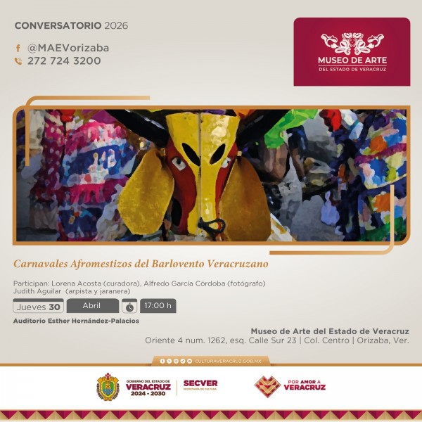 | .- Xalapa, Ver., martes 28 de abril de 2026.- La Secretaría de Cultura de Veracruz invita a conocer la exposición Carnavales afromestizos del Barlovento veracruzano, del 30 de abril al 30 de agosto en la Sala Permanente de Arte Popular del Museo de Arte del Estado de Veracruz (MAEV), en Orizaba, de martes a domingo, en horario de 9:30 a 18:00 horas. La entrada es gra... |