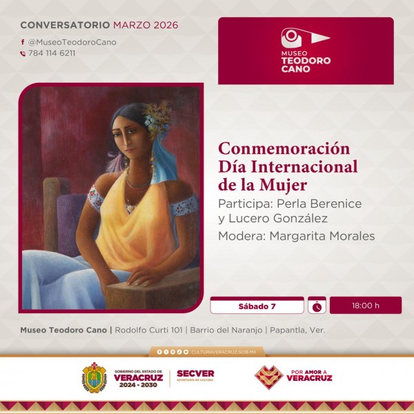 | .- Xalapa, Ver., viernes 06 de marzo de 2026.- La Secretaría de Cultura de Veracruz (SECVER) invita al público general al Conversatorio Conmemoración del Día Internacional de la Mujer, el sábado 07 de marzo a las 18:00 horas, en el Auditorio del recinto cultural Museo Teodoro Cano, en Papantla. La entrada es libre.