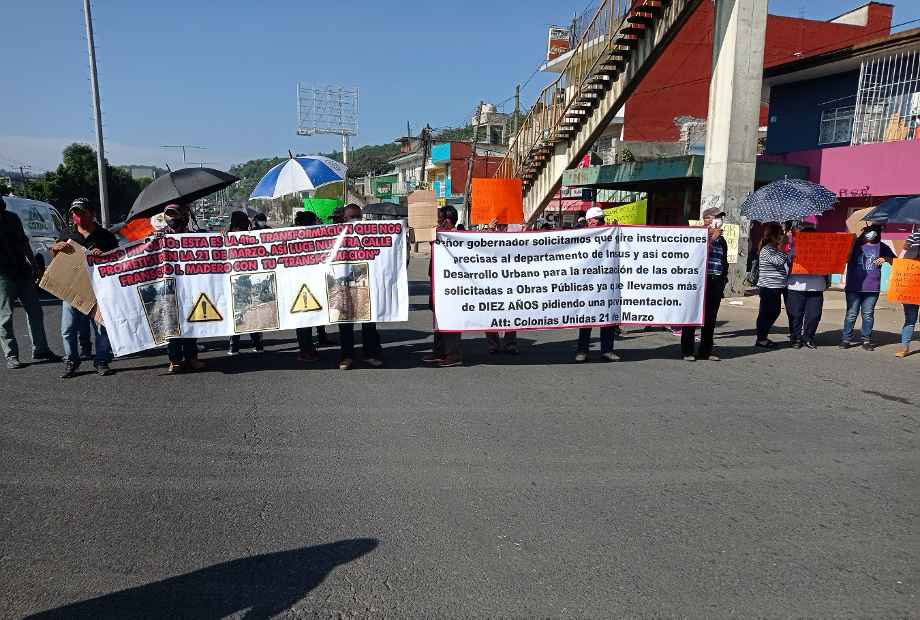 Desde temprana hora se dieron cita vecinos de las Colonias 21 de marzo, Represillas, Loma Bonita, para bloquear el Boulevard Xalapa-Banderilla, siendo la segunda vez que bloquean por la falta de atención de las Autoridades Municipales, ya que solo exigen que les sea pavimentada la Calle Francisco I. Madero y la Prolongación de la misma Calle, siendo que es el acceso principal para dichas Colonias, siendo que dicha vialidad está en muy malas condiciones de transitar, indicando que han entregado oficios a las Autoridades Municipales y Estatales y en el Ayuntamiento les exigen las escrituras de sus predios, por lo que a su vez también exigen al Instituto Nacional de Suelo Sustentable (INSUS) a que les Regularice sus predios y a su vez les haga entrega de sus escrituras, siendo que llevan más de treinta años habitándolos y es la fecha en que no se los han regularizado dichas Autoridades, a lo cual el Señor Félix Romero Martínez dijo que llevan más de 10 años solicitando la pavimentación de dichas calles, apenas les indicaron que no les pueden pavimentar porque es una Colonia irregular, pero señalo que son más de 300 familias las afectadas por la falta de pavimentación de la Calle, por lo que piden que si en otras Colonias han pavimentado sin escrituración que también se los hagan, ya que tienen derecho a los servicios públicos, por parte de las Autoridades Gubernamentales…